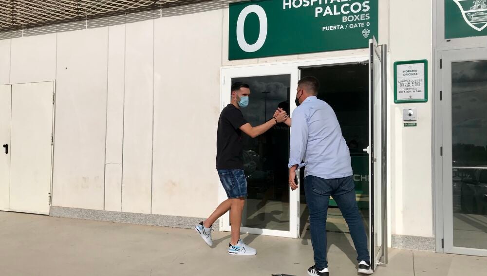 El nuevo delantero del Elche, que el 10 de septiembre cumplirá 33 años ataviado con su mascarilla se ha metido rápidamente en las oficinas para terminar de perfilar los últimos detalles de su contratación, por una temporada, y conocer las instalaciones de la que será su casa a lo largo de la presente temporada.