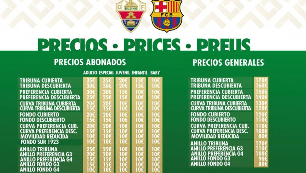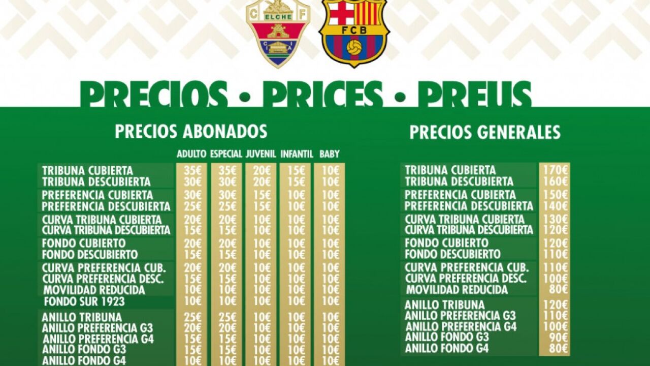 El Elche ha puesto a la venta las entradas para el partido ante el FC Barcelona, que son mucho más caras para el público general y con algunas variaciones para los abonados, con cambios de cinco euros en algunas gradas. Las localidades para los 24.000 aficionados con abono oscilan entre los 10 y los 35 euros, mientras que los no abonados tendrán que pagar desde los 80 euros de la más barata a los 170 euros, la más cara.