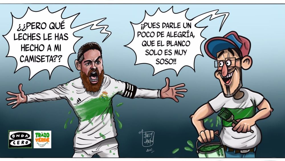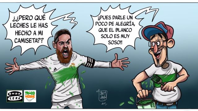 El equipo de Fran Escribá viaja cargado de optimismo a la capital de España, donde espera puntuar y plantar cara al Real Madrid. Así lo refleja en la viñeta de esta semana el artista José Antonio Belmonte, que le estampa la franja verde en el pecho al capitán blanco Sergio Ramos.