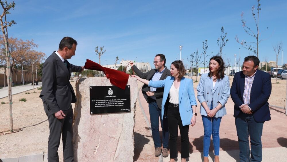 Coincidiendo con la conmemoración de ese tercer aniversario de la activación del estado de alarma por el coronavirus, el Ayuntamiento de Elche ha rendido homenaje a las víctimas de la pandemia con el descubrimiento de un monolito y una placa conmemorativa en el ‘Jardín Homenaje a las víctimas del Covid-19’, ubicado junto al Cementerio Viejo.