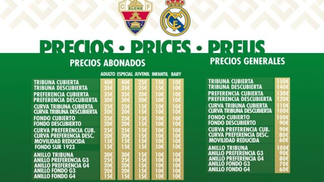 A doce días para esa cita señalada en el calendario, el Elche ha anunciado el precio de las localidades. Sus abonados pagarán entre los 15 euros de la entrada más barata a los 40 euros en Tribuna. Los no abonados, entre los 60 euros en Anillo Fondo y los 150 euros de la Tribuna Cubierta. Los infantiles y baby sólo tendrán un precio reducido si son abonados, a 10 euros en todo el estadio menos en Tribuna, donde pagarán 15 euros.