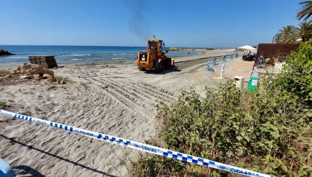 Durante la mañana cinco máquinas de Urbaser y de la Entidad de Saneamiento de Aguas de la Generalitat han estado trabajando en la retirada del vertido de la arena, eliminándose una capa de entre 10 y 15 centímetros de espesor que ahora va a ser sustituida por arena de la misma zona ya cribada después de la limpieza y que ha superado todos los análisis.