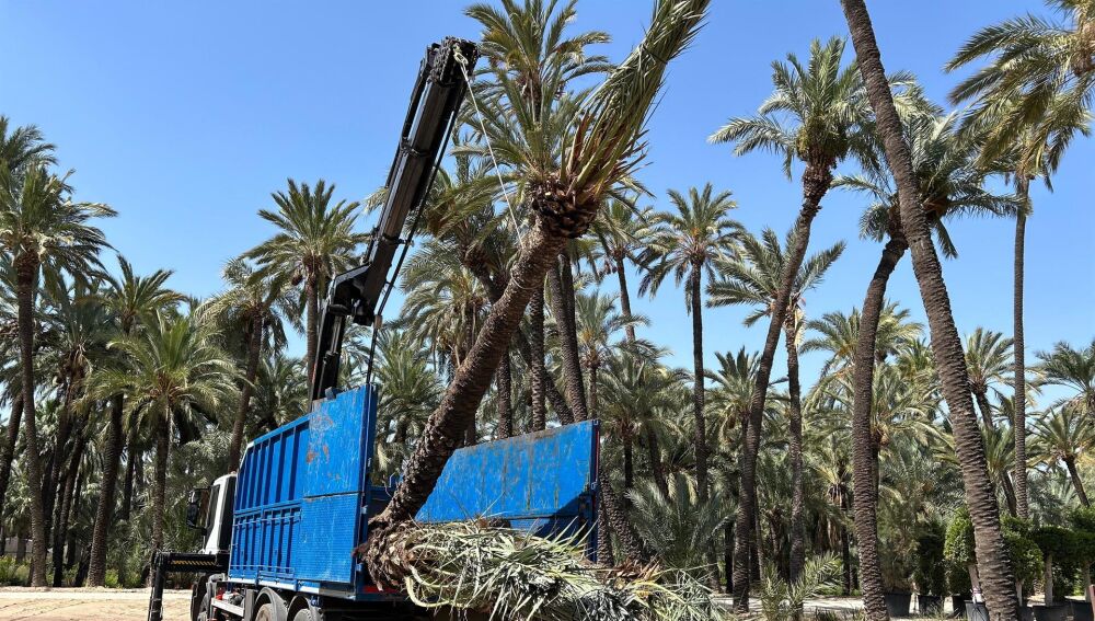 El Ayuntamiento de Elche ha comenzado este martes a trasplantar en el Huerto de La Molinera buena parte de las palmeras que han sido retiradas de la calle Pedro Juan Perpiñán después de que un informe técnico indicara que muchas de ellas tenían un riesgo "alto o muy alto" de desplomarse sobre la vía pública.