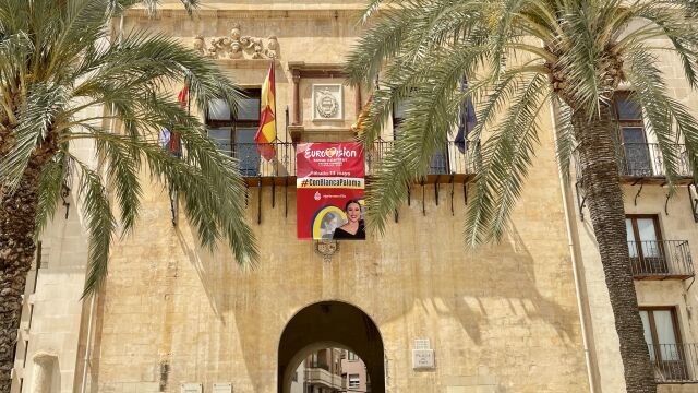 Una lona con la imagen de Blanca Paloma preside la fachada principal del Ayuntamiento de Elche desde este viernes, un día antes de que la artista ilicitana actúe en el Festival Internacional de Eurovisión 2023, que tendrá lugar el sábado por la noche en el Liverpool Arena.