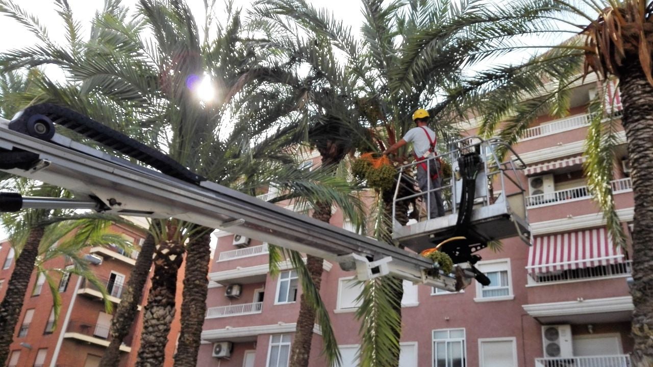 Por otro lado, la Junta de Gobierno Local ha acordado sacar a concurso público la poda de 6600 palmeras de la vía pública, tanto en el caso urbano como en pedanías. Una de las novedades que presenta el pliego de licitación es que la poda de palmeras se deberá llevar a cabo si hace uso de elementos mecánicos por norma general y con las salvedades para ello estipuladas claramente.