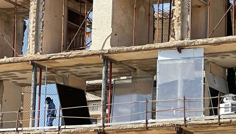 Este viernes se ha podido ver a trabajadores con equipos de protección individual en el interior de la estructura del viejo edificio del que se tiene que retirar el amianto de sus elementos