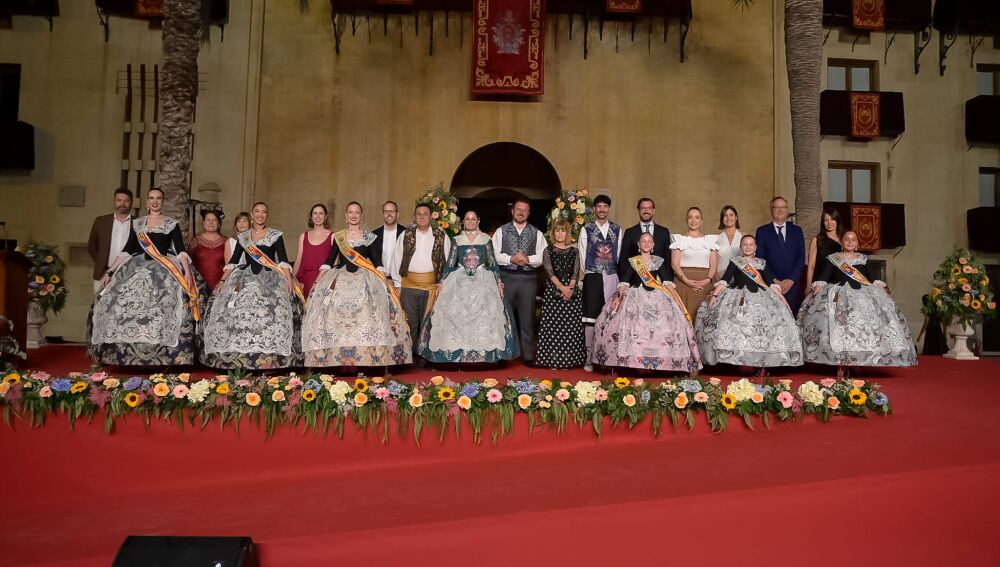 Además, las nuevas Reinas y Damas de las Fiestas de Elche han recibido en el escenario la bienvenida de representantes de delegaciones festeras de las localidades como Santa Pola, Crevillent, San Vicente del Raspeig, Catral, Benejúzar, San Juan de Alicante, Dénia y Jumilla.