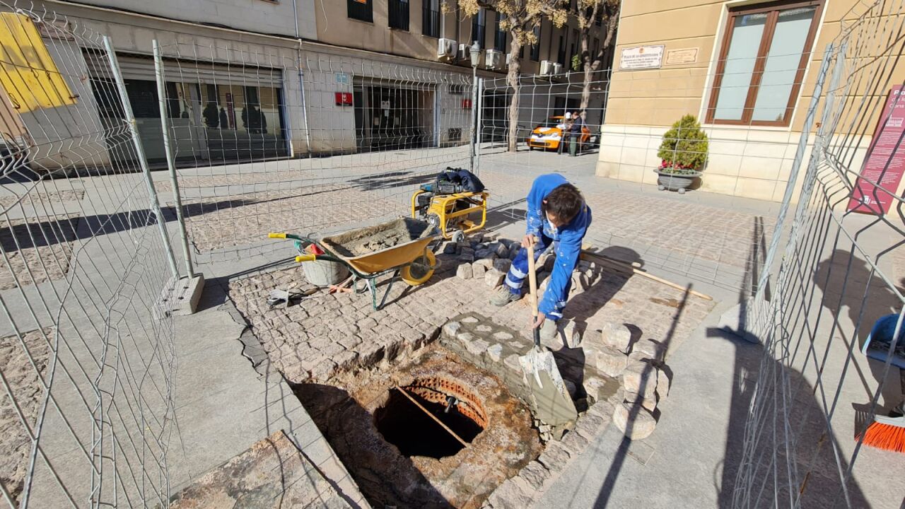 Las obras de remodelación de la Plaza de Arriba están incluidas en el ‘Plan Elda Renace’ y marchan a buen ritmo. El descubrimiento de ese refugio antiaéreo de la Guerra Civil y sus entradas no afecta al desarrollo de los trabajos en superficie, por lo que los plazos para su finalización continúan según lo previsto.