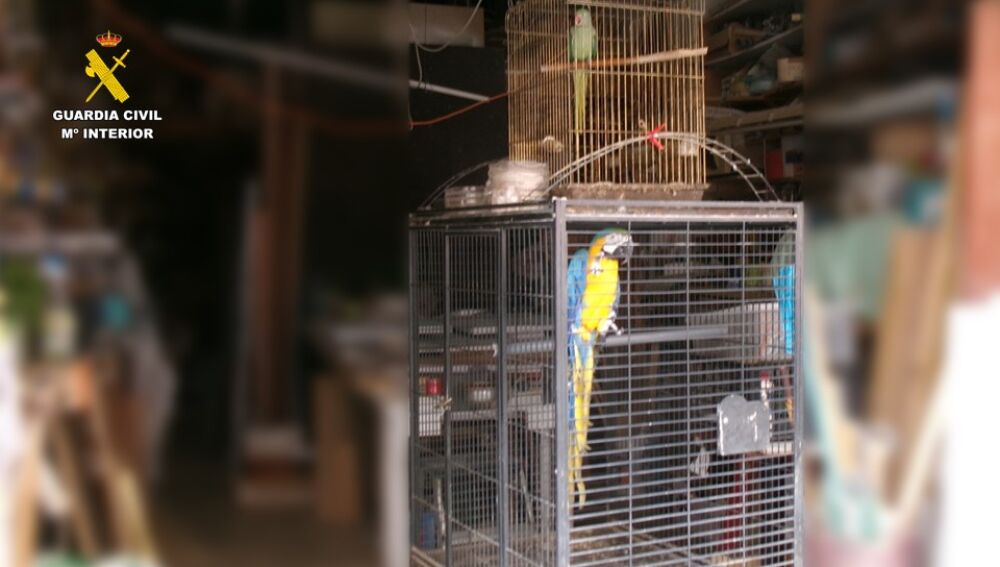 La Guardia Civil ha inmovilizado cautelarmente dos ejemplares de aves exóticas, un guacamayo azul y amarillo y una cotorra de Kramer, que ha sido localizados en el interior de un garaje urbano de Santa Pola.