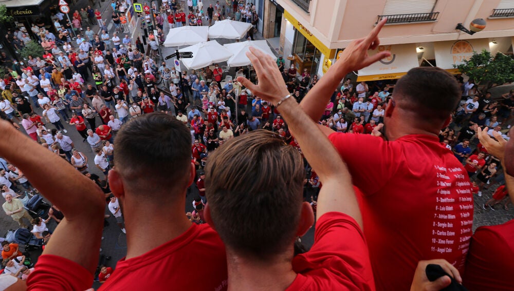 El presidente de la entidad rojilla, Juanma Domingo, mostró su orgullo por el triunfo alcanzado. «Estamos muy orgullosos de lo que hemos conseguido, por eso quiero agradeceros la confianza», dijo al conjunto. «Llegar donde hemos llegado no ha sido fácil, no nos han regalado nada. Hemos pasado tres meses muy malos pero estamos aquí con otro ascenso con el que ya sois parte de la historia del club y esperamos que sea un paso más», añadió el máximo representante de la entidad romana, quien también entregó una camiseta conmemorativa del ascenso al alcalde antes de que también hablasen dos de los capitanes de la plantilla.