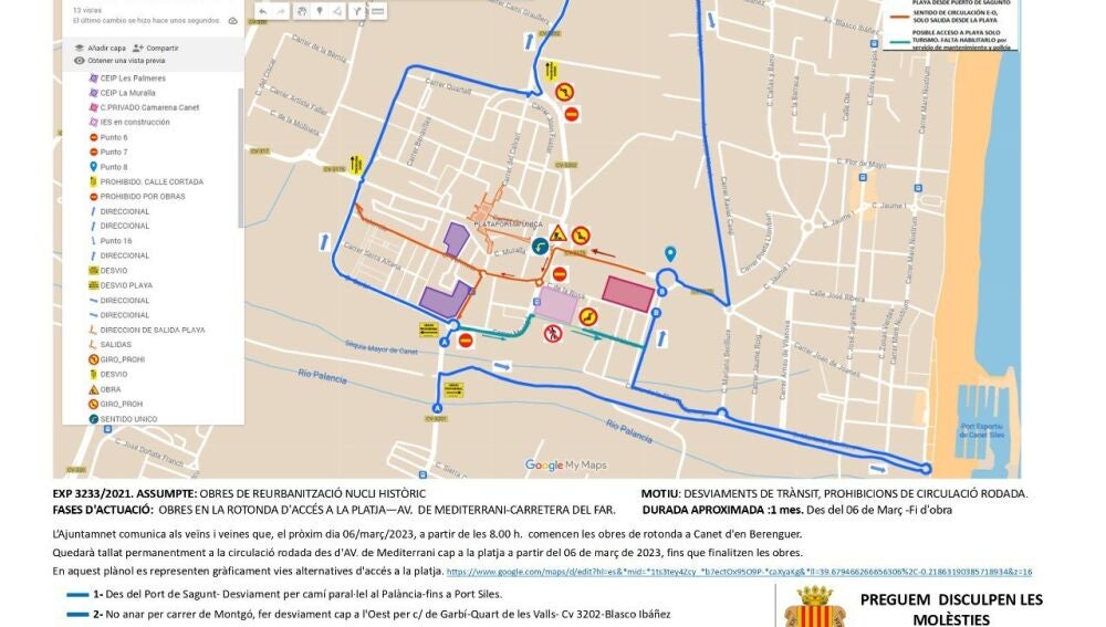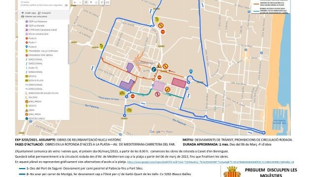 El Ayuntamiento de Canet d'en Berenguer anuncia alteraciones en el tráfico de esta localidad de El Camp de Morvedre desde esta misma semana y hasta la finalización de los trabajos. Concretamente, se trata de una medida que afecta a las vías habituales que se emplean para desplazarse entre el núcleo urbano de Canet y su playa. Se cierra al tráfico la rotonda del Campo de Fútbol La Figuereta y, por ello, las alternativas que ofrece el Consistorio canetero son dos: o bien el Camino Paralelo al Río Palancia o bien rodear el núcleo urbano por el oeste, es decir, por las calles Garbí, Quart de les Valls y Blasco Ibáñez de Canet d'en Berenguer.