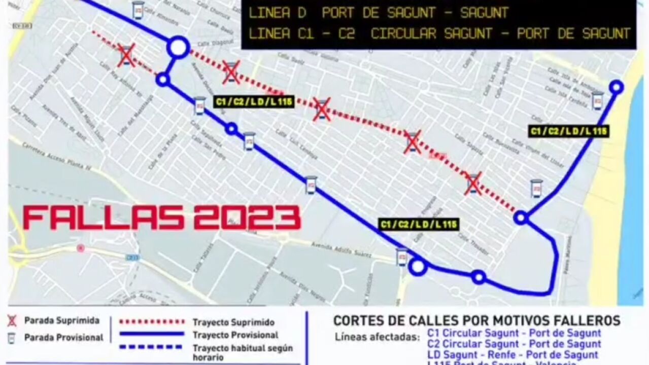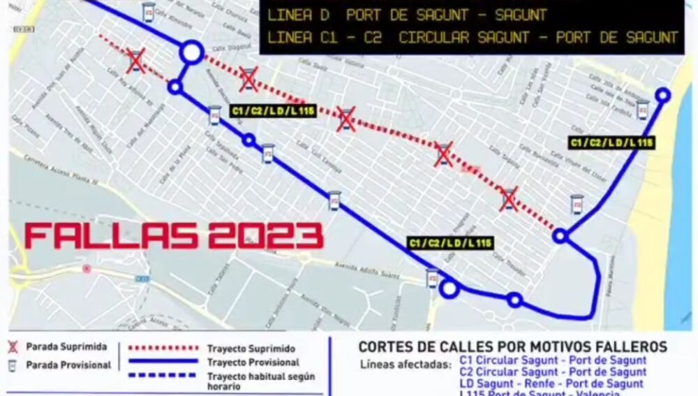 Así, las Fallas obligan a a desviar, desde hoy y hasta el próximo día veintiuno, el recorrido del autobús por el Puerto. Desde hoy y hasta que las Fallas pasen, el autobús cambia su trayecto habitual de la Avenida del Camp de Morvedre por, con carácter temporal, la Avenida del Nueve de Octubre, que será donde hará las correspondientes paradas hasta el citado próximo día veintiuno. Un cambio que afecta tanto a los autobuses urbanos - líneas operadas por el Ayuntamiento de Sagunto - como a los interurbanos - es decir, los que conectan la comarca con València -.