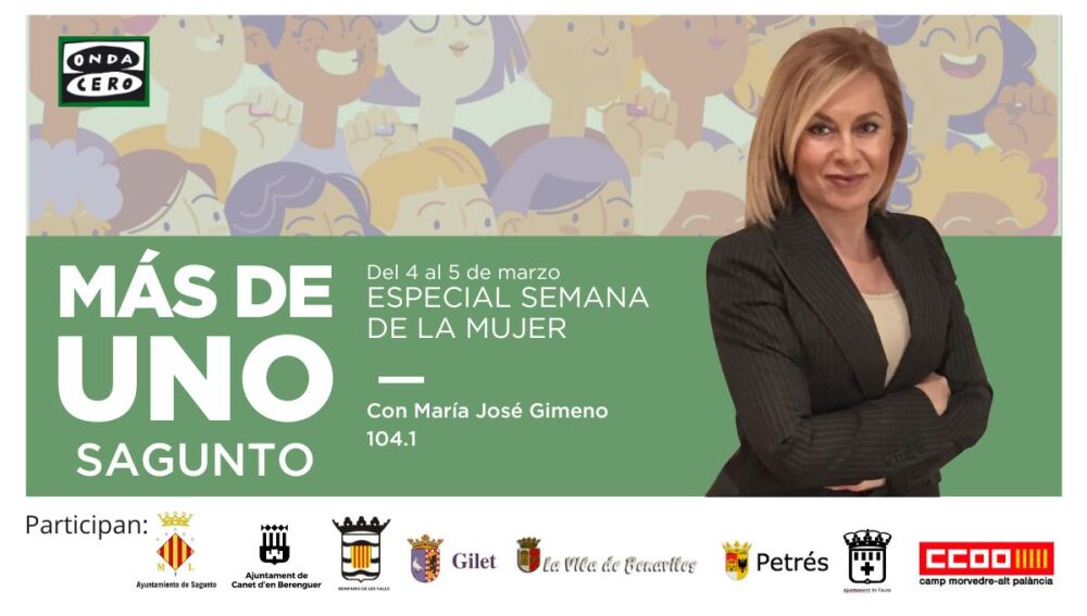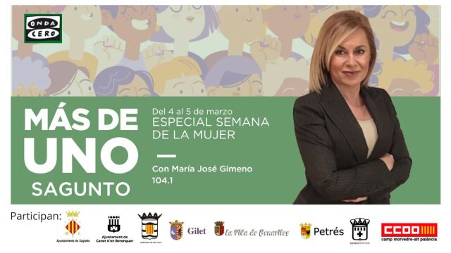 Del 4 al 8 de Marzo, programación especial en Onda Cero Sagunto, 'Semana de la Mujer', con las voces de mujeres destacadas, ayuntamientos, sindicatos, asociaciones... Todos los días desde las 12.20 a las 13.30, con María José Gimeno.