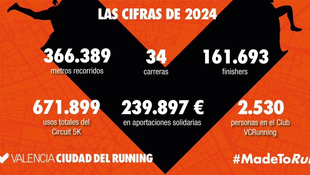 Valencia Ciudad del Running celebra su X aniversario con unas grandes cifras. Y es que un año más se ha demostrado la auténtica pasión por correr que se vive en esta ciudad, que durante el 2024, además de los dos nuevos récords mundiales conseguidos (Agnes Jebet en 10K y Yomif Kejelcha en medio maratón) ha visto cómo se alcanzaba la cifra de 161.693 llegados a meta entre las 34 pruebas de running, con inscripción y clasificación oficial, que tuvieron lugar en Valencia Ciudad del Running.