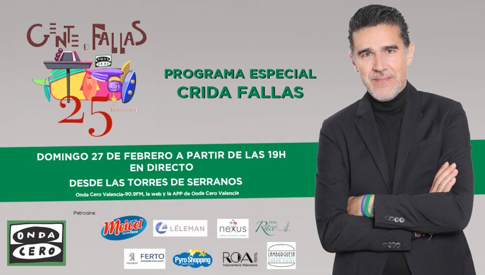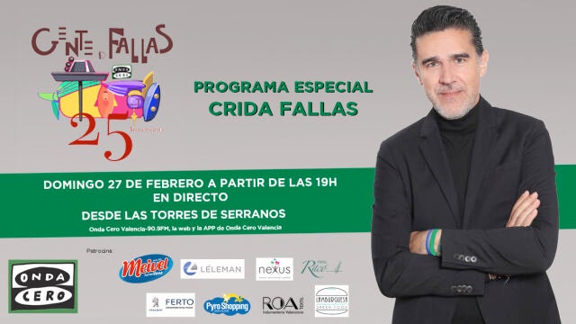 PROGRAMA ESPECIALGente de Fallas desde la CridaEl próximo domingo 27 de febrero a partir de las 19:00h, el programa Gente de Fallas se emite en directo desde las Torres de Serranos para contar en directo la Crida, el acto que enciende la mecha de las fallas 2022 ondacero.es Valencia | 24.02.2022 13:58 Gente de Fallas desde la Crida | ocr