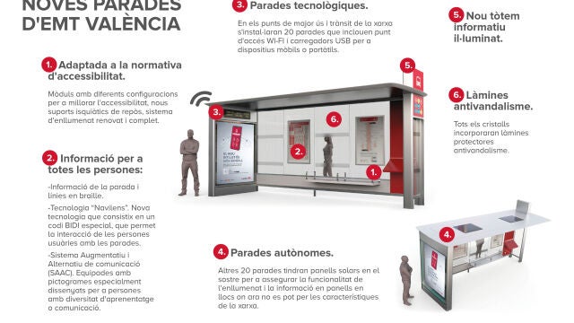 Los paneles informativos electrónicos de estimación de tiempos se instalarán en 275 marquesinas. Además, todas las nuevas paradas llevarán incorporadas un tótem informativo iluminado que permitirá mejorar el sistema de información y de alumbrado, apoyos isquiáticos (mobiliario urbano accesible) y láminas antivandálicas en todos los cristales.