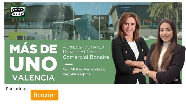 Programa especialMás de Uno desde el Centro Comercial BonaireEl próximo viernes 24 de marzo Más de Uno Valencia se emitirá en directo desde Bonaire. Ven y disfruta del programa en un entorno abierto. Bonaire, el centro comercial de tus momentos felices. ondacero.es Valencia | 20.03.2023 10:24 Más de Uno Valencia día 24/03/2023 | ondacero.es