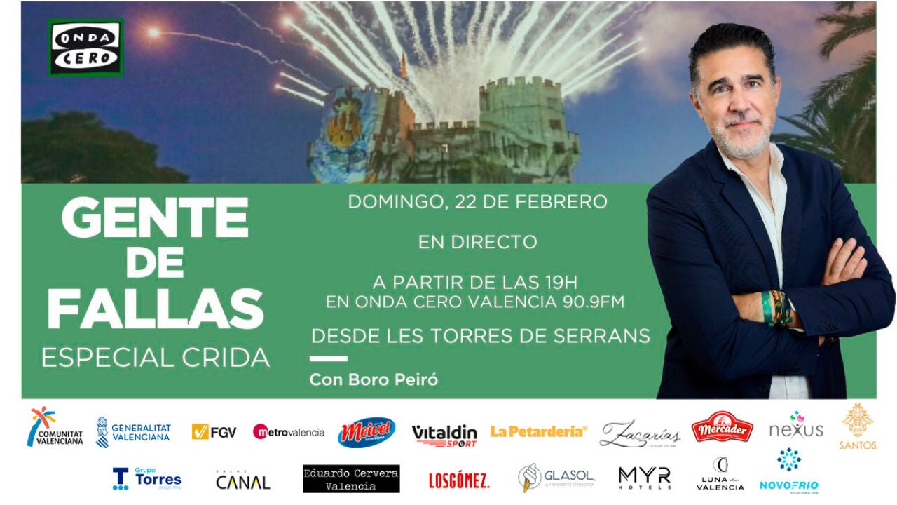 El domingo 22 de febrero a partir de las 19:00h, el programa Gente de Fallas se emite en directo desde les Torres de Serrans para contar en directo la Crida, el acto que enciende la mecha de las fallas 2026
