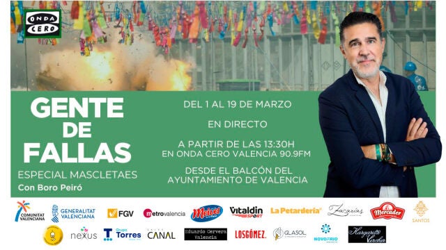 Del 1 al 19 de marzo gente de fallas en directo desde la mascletà desde el balcón del Ayuntamiento de Valencia. Boro Peiró, especialista en esta materia, nos harán sentir el estruendo y el olor a pólvora a través de la radio.
