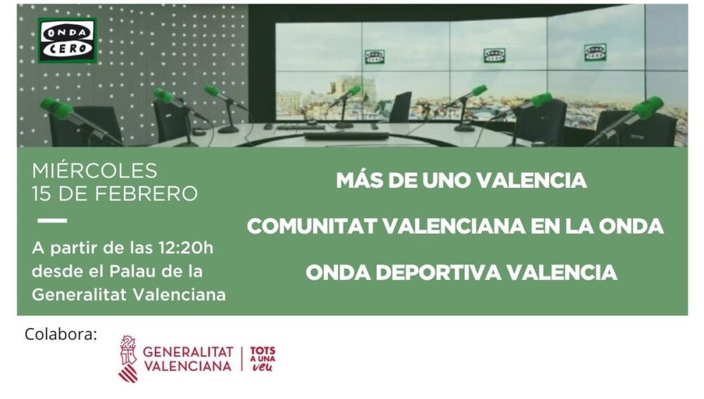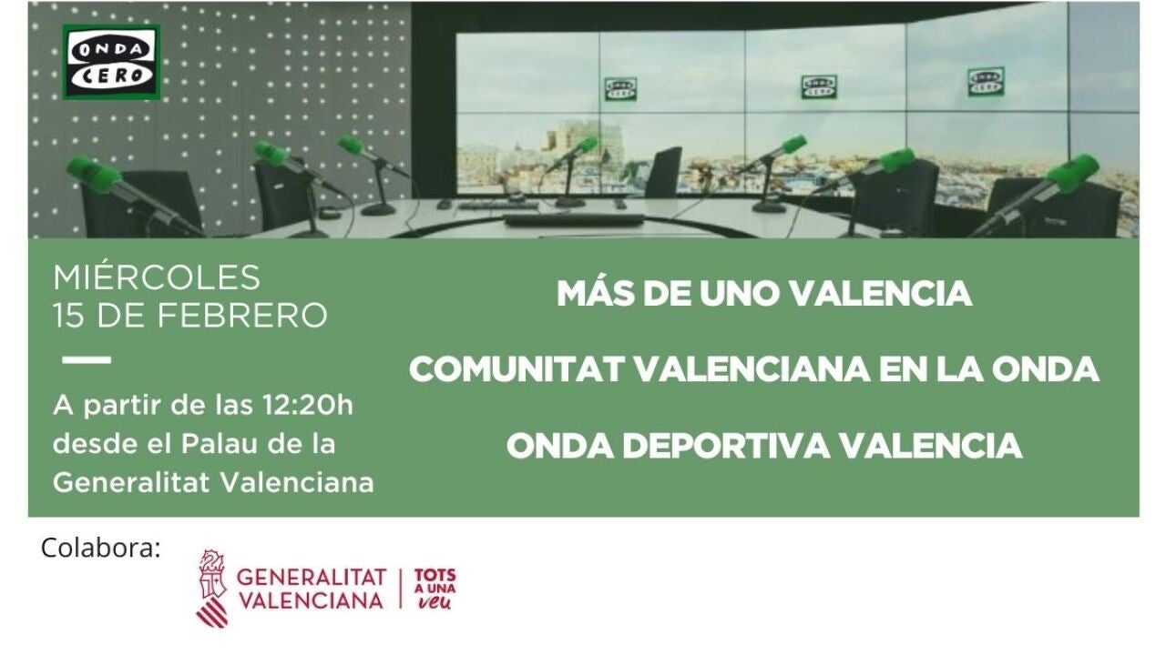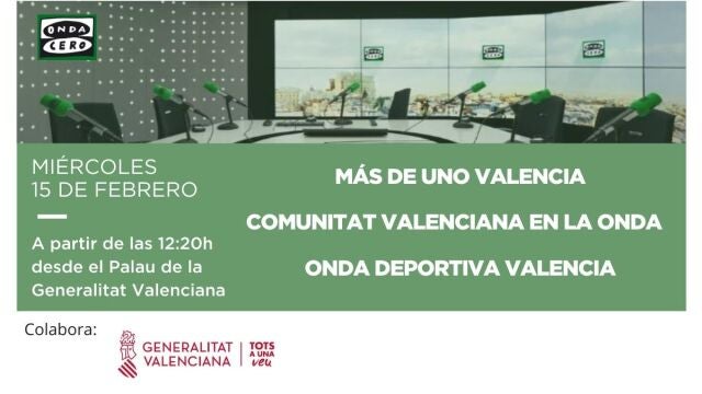 El miércoles 15 de febrero con motivo de la semana de la radio, a partir de las 12:20 Más de Uno Valencia, Comunidad Valenciana en la Onda y Onda Deportiva Valencia, se emitirán en directo desde el Palau de la Generalitat Valenciana.