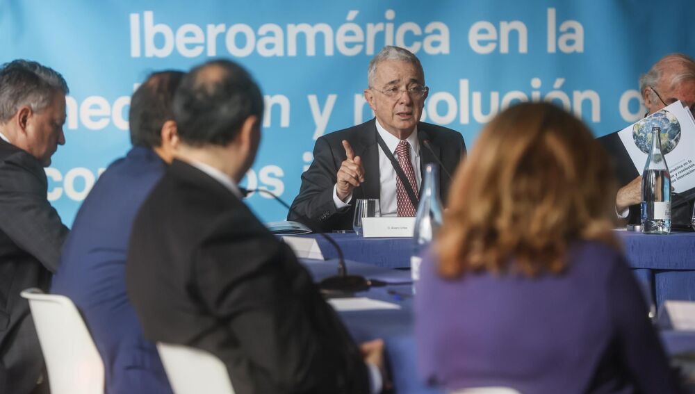 El expresidente de Colombia Álvaro Uribe interviene en la inauguración del I Foro Internacional 'Iberoamérica en la mediación y resolución de conflictos internacionales', en el Palacio de la Exposición de Valencia. - | Rober Solsona - Europa Press