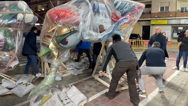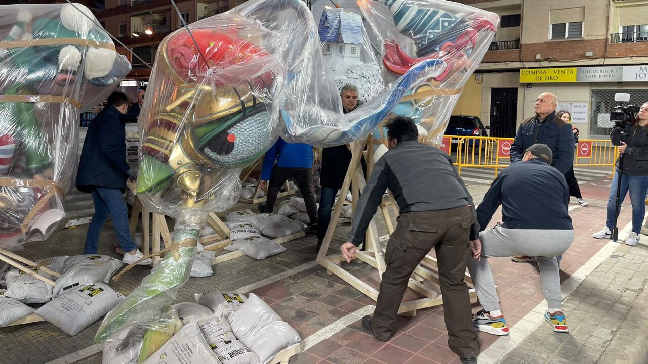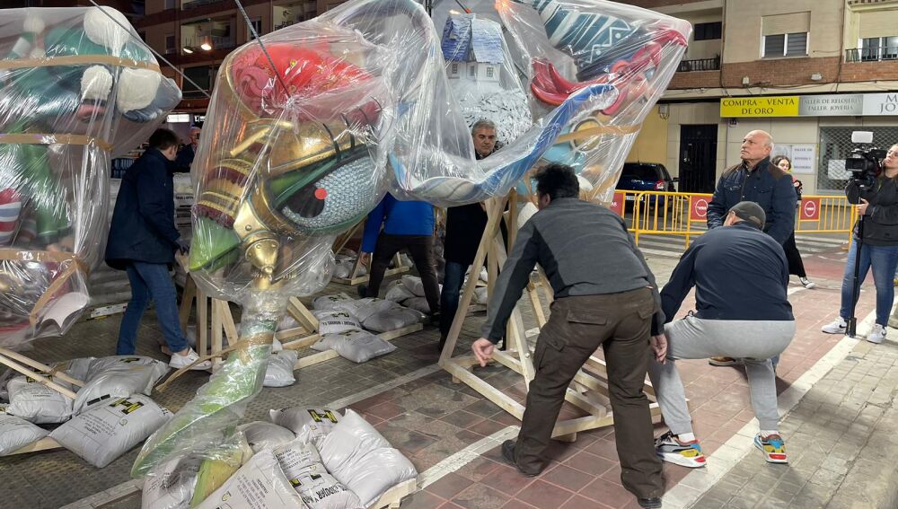 La comisión Antiga de Campanar utilizó tres góndolas, que es como se conoce a los camiones que se usan para trasladar a las piezas, que llegaron a su destino por la tarde y estuvieron trabajando hasta las nueve de la noche. De esta forma, se ha podido ver a las primeras piezas en la plaza del barrio de Campanar, mostrando así sus cartas en las Fallas 2024 de Valencia.