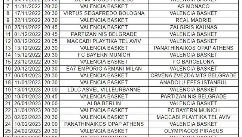 Una Euroliga que tendrá como segunda jornada de nuevo en la Fonteta el 14 de octubre a las 20:45 ante Asvel Villerbaune mientras que el primer desplazamiento será a tierras turcas el 18 de octubre para enfrentarse al Anadolu Efes Pilsem. La liga europea se cerrará el 14 de abril en tierras catalanas para enfrentarse al FC Barcelona de Kalinic entre otros.