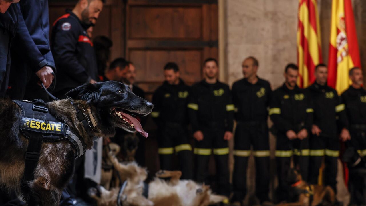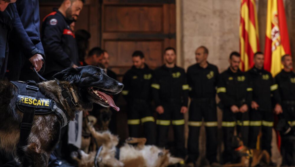 Decenas de bomberos acompañados por los perros han protagonizado un acto de agradecimiento en el Palau de la Generalitat en nombre de toda la sociedad valenciana. "Representáis la humanidad, la solidaridad, la conciencia y la profesionalidad más allá de vuestro trabajo cotidiano. Estamos absolutamente orgullosos de vosotros", ha proclamado el 'president', Ximo Puig, acompañado por la consellera de Interior, Gabriela Bravo.