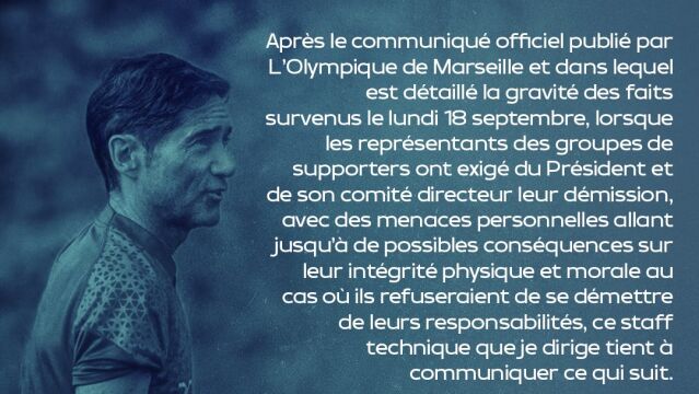 "Tras el comunicado oficial emitido por el club y donde se detalla la gravedad de los hechos acontecidos el lunes 18, cuando los representantes de las Asociaciones de Aficionados exigieron al Presidente y a su Junta Ejecutiva su dimisión, con amenazas personales y posibles consecuencias para su integridad física y moral, en caso de no renunciar a sus cargos, este cuerpo técnico que dirijo quiere comunicar lo siguiente: