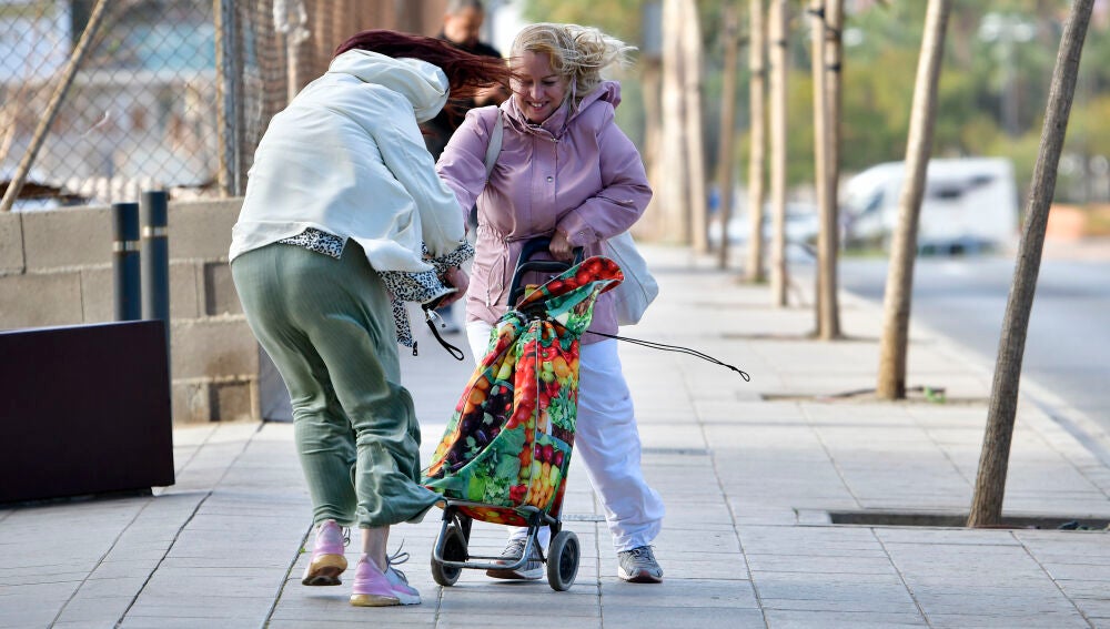 Varias personas intentan caminar por la calle mientras sopla fuertemente el viento, en una imagen de este lunes. | EFE / Carlos Barba