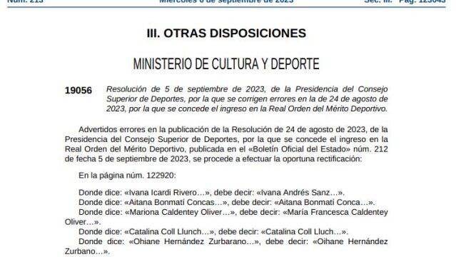 "Advertidos errores en la publicación de la Resolución de 24 de agosto de 2023, de la Presidencia del Consejo Superior de Deportes, por la que se concede el ingreso en la Real Orden del Mérito Deportivo, publicada en el «Boletín Oficial del Estado» núm. 212 de fecha 5 de septiembre de 2023, se procede a efectuar la oportuna rectificación: