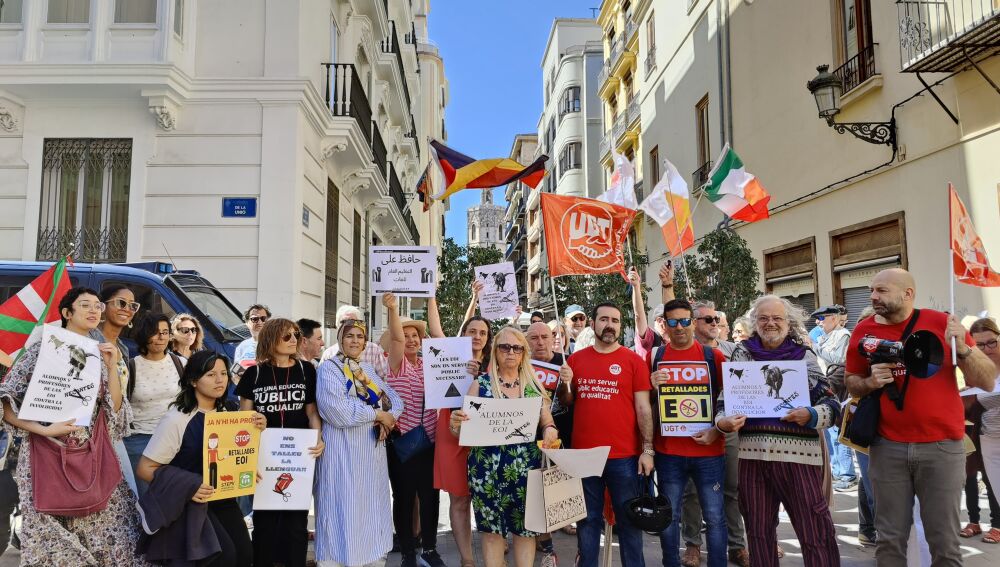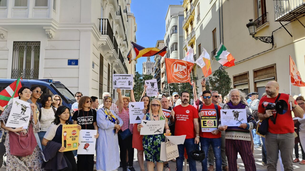 Alumnos y profesores de las escuelas oficiales de idiomas se han concentrado ante Les Corts para denunciar el recorte, que el próximo curso se realizará, en la oferta y grupos en varias lenguas entre ellas inglés, castellano o valenciano.