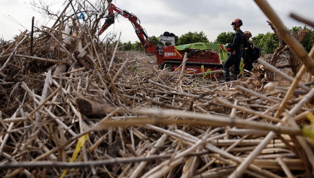 La UME y la Benemérita creen que aquí podría encontrarse el cuerpo sin vida de una de las desaparecidas. "Creemos que puede estar en esta zona porque no está al 100% limpia. Por ello, seguimos buscando en ella", explica el teniente del Grupo de Reserva y Seguridad (GRS) Número 3 de la Guardia Civil de València, Rubén Rodríguez.