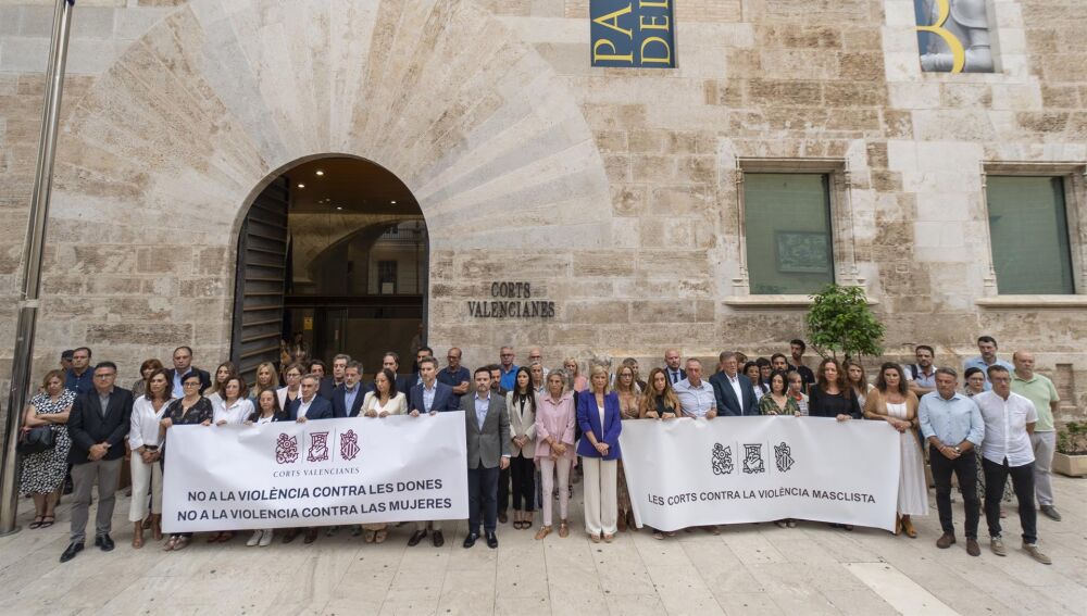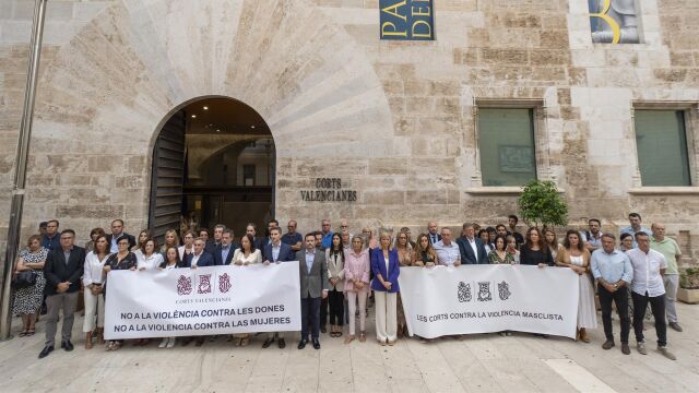 Todos alineados, pero con pancartas distintas. Los cuatro grupos con representación en Les Corts se han dividido en dos pancartas durante los tres minutos de silencio convocados por la presidencia del parlamento autonómico para condenar los asesinatos machistas en Orihuela Costa (Alicante) y Castelló de la Plana.