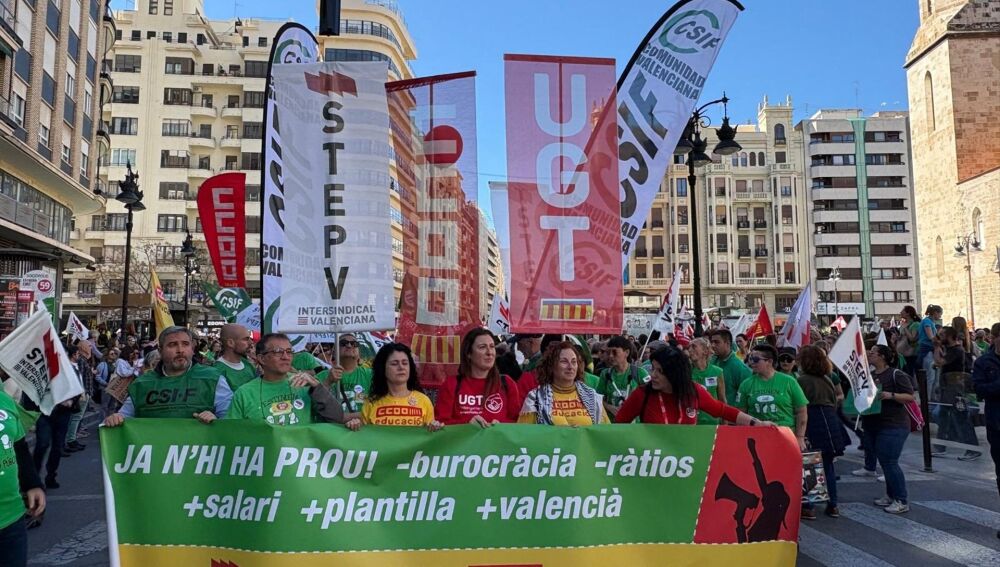 La manifestación, convocada por el Sindicat de Treballadors i Treballadores de l'Ensenyament del País Valencià (STEPV), UGT Ensenyament del País Valencià, la Federació d'Educació de CCOO y la Central Sindical Independiente y de Funcionarios (CSIF), ha arrancado este martes a las 12.00 horas desde la plaza de San Agustín de València y ha recorrido las principales calles de la ciudad.