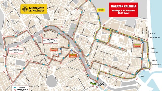 El viernes 1 de diciembre, a partir de las 22:00 horas, se cerrará al tráfico rodado el puente de Montolivet en ambos sentidos y la avenida del Profesor López Piñero en dirección hacia el centro de la ciudad, para el montaje del arco salida de la prueba. Por su parte, las avenidas Germans Maristes e Institut Obrer de València, en ambos sentidos, también permanecerán cortadas desde las 22:00 horas y hasta las 6:00 horas del sábado, dejando acceso a los vados.