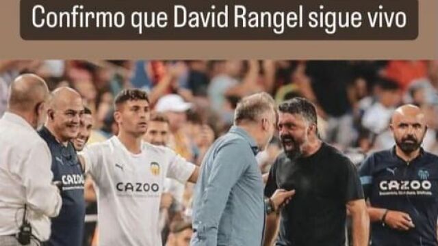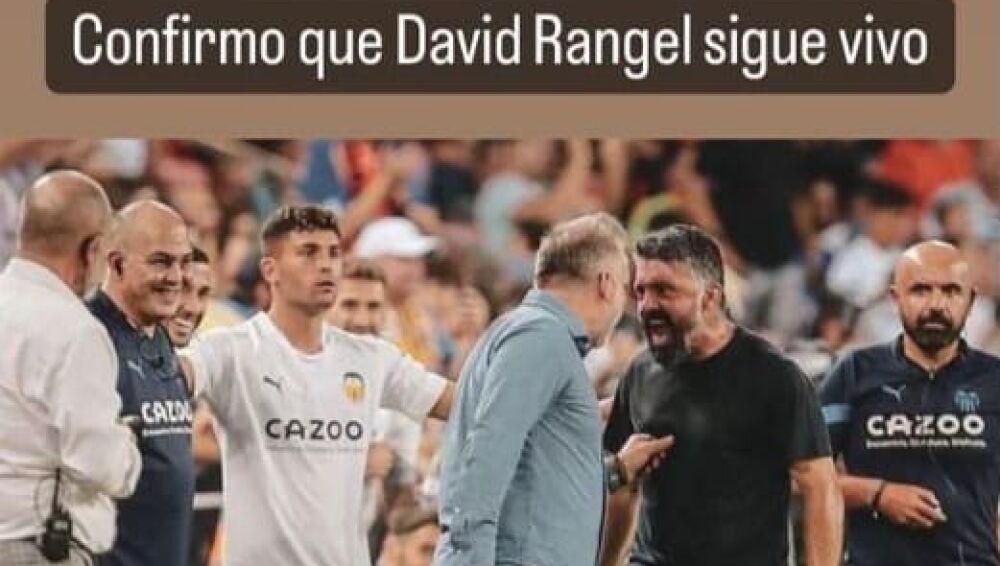 "Confirmo que David Rangel sigue vivo". La frase es de Hugo Duro en sus redes sociales acompañada de una foto de los compañeros de Superdeporte que se ha hecho viral en la que se ve a Gennaro Gattuso cara a cara con el delegado del equipo en un lance del partido del sábado ante el Girona. No cabe duda que el técnico italiano es de sangre caliente y eso gusta en Mestalla.