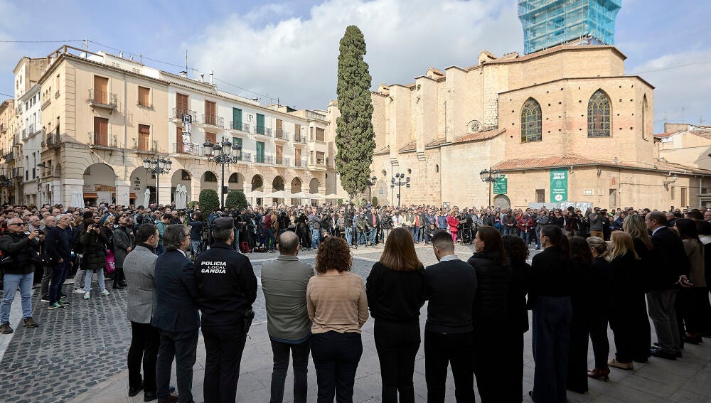 Vista general del minuto de silencio convocado por el Ayuntamiento de Gandia, de luto oficial hasta el sábado, realizado en la plaza Mayor en recuerdo de Arturo Torró. | EFE / Natxo Francés