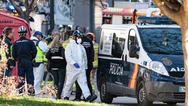 Agentes de la Policía Científica y técnicos y médicos forenses en los alrededores del edificio incendiado. | EFE/Biel Aliño