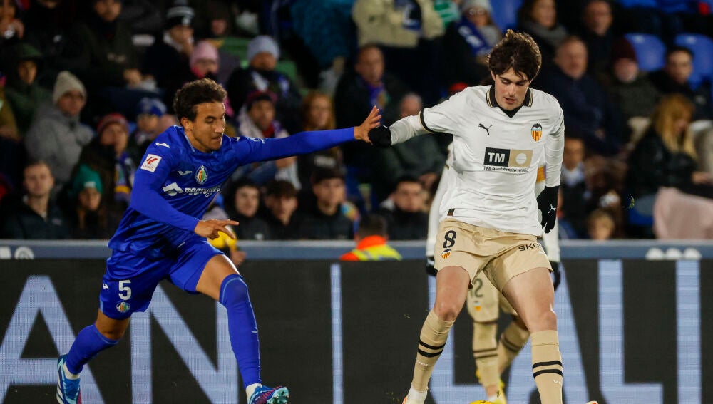 El Valencia acabó con nueve futbolistas en el Coliseum en la derrota 0-1 ante el Getafe. A la expulsión de Paulista, por doble amarilla, se sumó en los minutos finales la de Javi Guerra con roja directa.