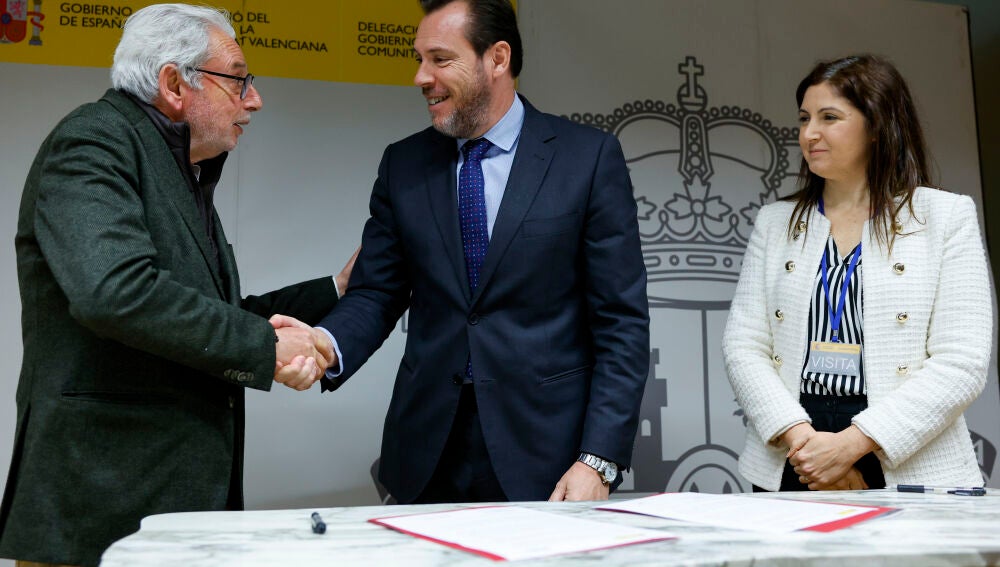 El ministro de Transportes, Óscar Puente, ha firmado este miércoles con los alcaldes de Paiporta y Picanya, Maribel Albalat y Josep Almenar, respectivamente, los convenios para reconstruir y reparar seis puentes y tres pasarelas que fueron dañadas por las inundaciones provocadas por la DANA del pasado 29 de octubre.