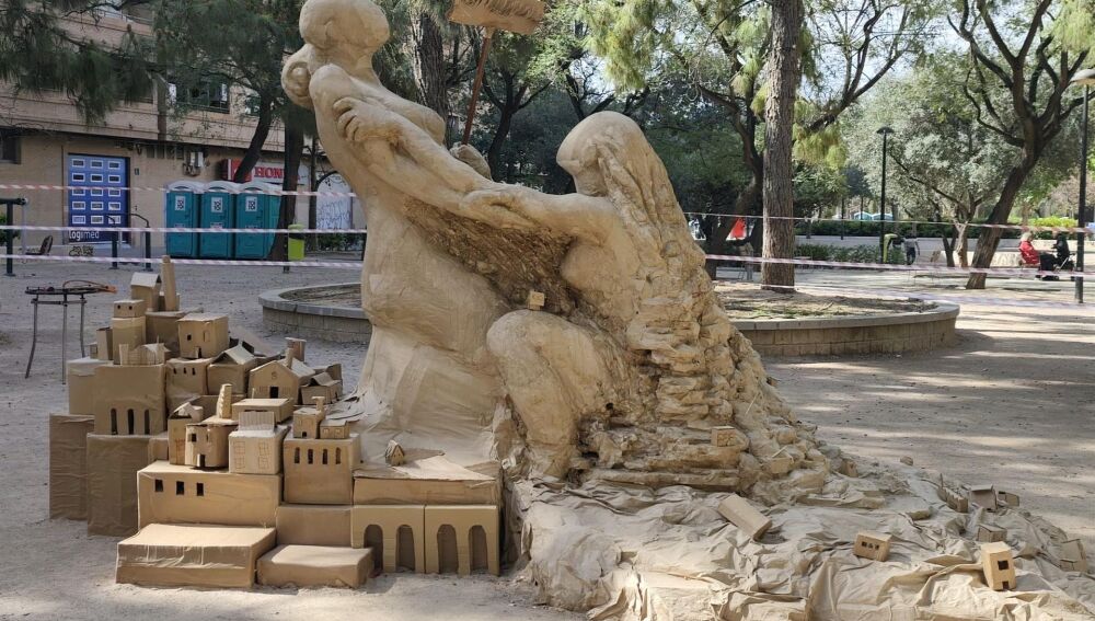 El centro de voluntariado La Cantina de València ha plantado la falla 'No olvidar la DANA'. El monumento representa a una voluntaria sacando del barro y salvando a una mujer, y rinde homenaje a las víctimas y afectados de la tragedia.