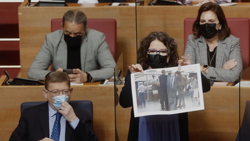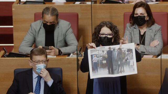 Desde su escaño, Oltra ha enseñado una fotografía en la que aparecen el ex president de la Generalitat con el PP, Francisco Camps, la ex representante de VOX, Cristina Seguí, y Alberto De Rosa, de Ribera Salud. “Unan los puntos”, ha apuntado, tras narrar supuestos intereses en común entre estas tres personas para “hacer daño” al gobierno del Botànic a través de la justicia.