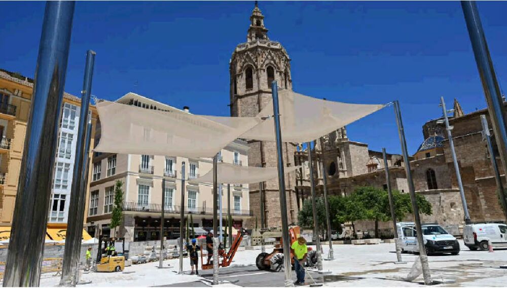 Este miércoles comienza oficialmente el verano y la plaza de la Reina de València sigue sin contar con los toldos previstos para dar sombra y combatir las altas temperaturas, a pesar de que el contrato de instalación establece que debían colocarse en primavera. La Empresa Municipal de Transportes (EMT) es la responsable última de su instalación, porque la colocación de las pérgolas va incluida en la gestión del aparcamiento subterráneo de la plaza, de la que se encarga la empresa municipal.