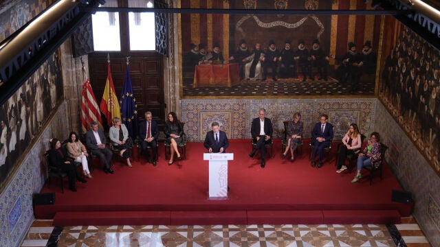 Todos los consellers han arropado al 'president' en su anuncio, una imagen que contrasta con la última convocatoria electoral, cuando compareció en solitario, al estar en contra del adelanto los miembros de Compromís. Este lunes incluso ha habido foto de familia.