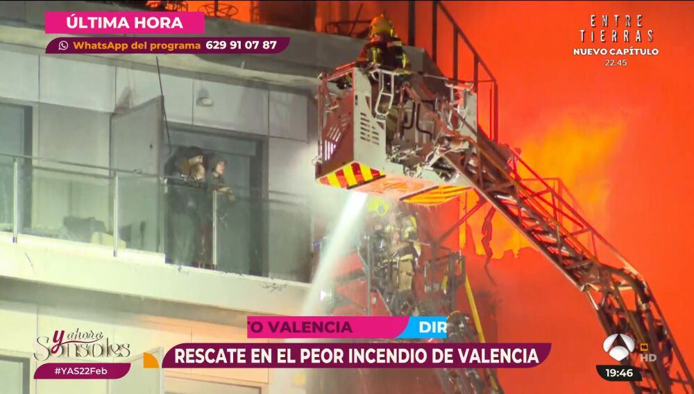 En los últimos minutos, los bomberos han conseguido rescatar a dos personas refugiadas en la terraza. Se han desplegado 14 dotaciones de bomberos municipales de Valencia, 2 dotaciones del cuerpo autonómico y se ha solicitado apoyo de la Unidad Militar de Emergencias para combatir este virulento incendio.
