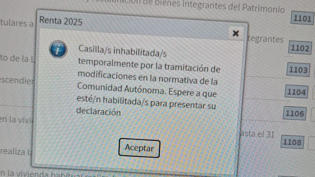 Más concretamente, las casillas correspondientes a las citadas deducciones autonómicas se encuentran temporalmente deshabilitadas. Al menos, en el momento de la redacción de esta información. Fuentes de la Conselleria de Hacienda explican a Onda Cero que el sistema de la Renta está todavía pendiente de adaptar esas casillas y que, por ello, se muestran deshabilitadas aunque la voluntad de la Agencia Tributaria, prosiguen desde Conselleria, es solucionarlo "lo antes posible".