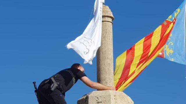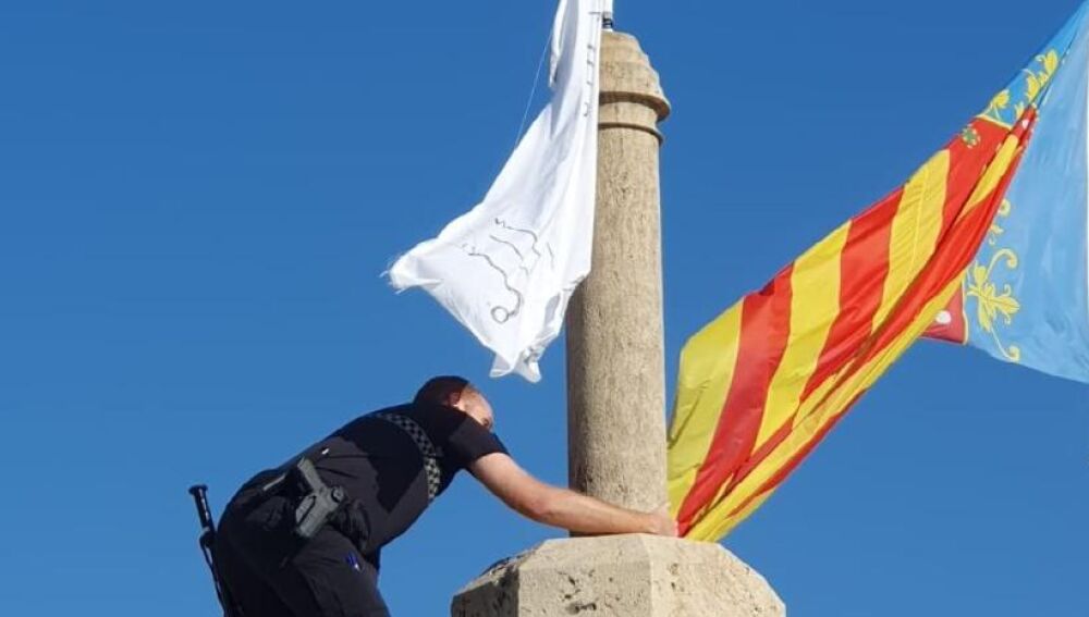 La Policía Local de València ha retirado este viernes una bandera blanca con versículos del Corán que se ha colgado en las Torres de Serranos de la ciudad.