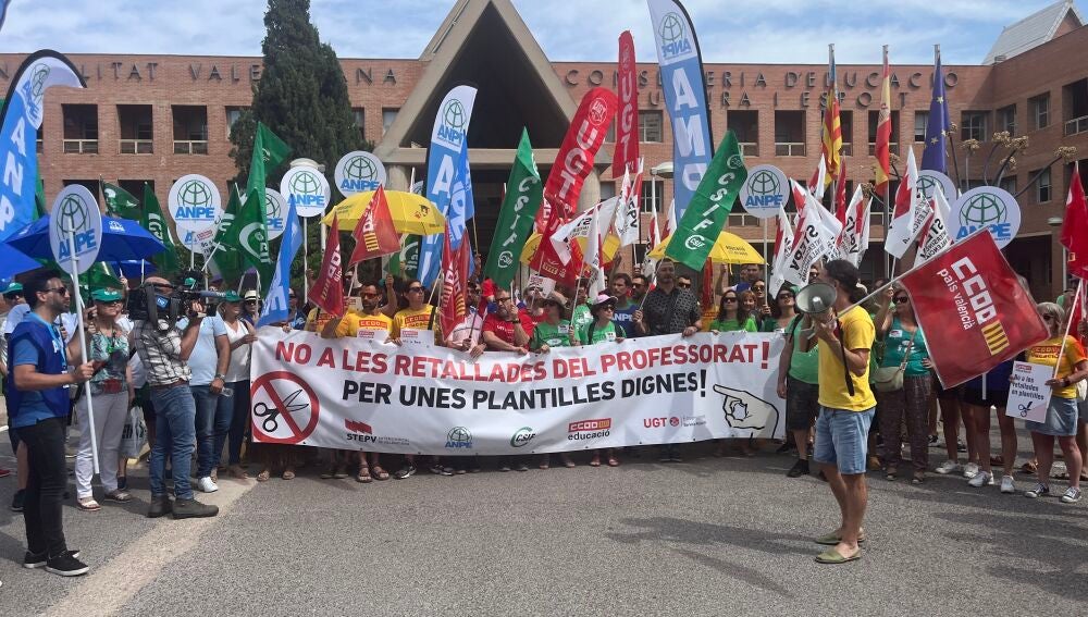 Los sindicatos educativos valencianos han vuelto a protestar a las puertas de la Conselleria de Educación. Lo han hecho, en esta ocasión, para denunciar "recortes" de la Generalitat en la plantilla de profesores y de profesoras que afectarían, de acuerdo con las formaciones sindicales, al profesorado de Formación Profesional, al de formación de adultos y al de enseñanza con atención a la diversidad.