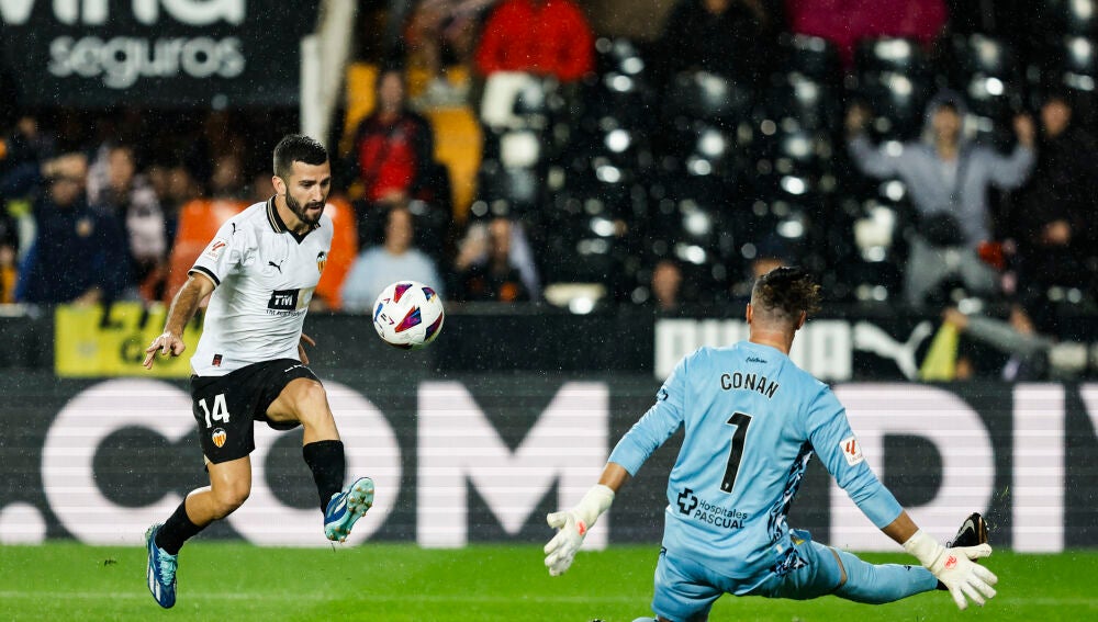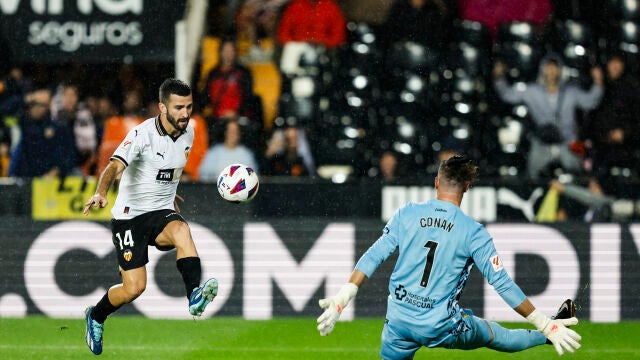 Con Pepelu y Javi Guerra llevando la dirección del partido, el equipo de Sergio González apenas inquietó la portería de Mamardashvili. Otro partidazo de Pepelu que provocó la expulsión de Robert Navarro por roja directa, El de Dénia se adelantó al futbolista gaditano y su pisotón sobre el tobillo del valencianista mereció la cartulina roja.